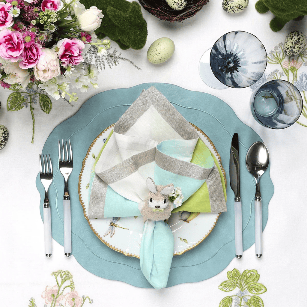 For a playful yet sophisticated nod to the holiday, skip the generic napkin rings and try the “Bunny Ear” fold. Fold a high-quality linen napkin into a long strip, wrap it around a single decorative egg (ceramic or chocolate), and pull the ends through a simple gold or wooden ring to create upright “ears.”